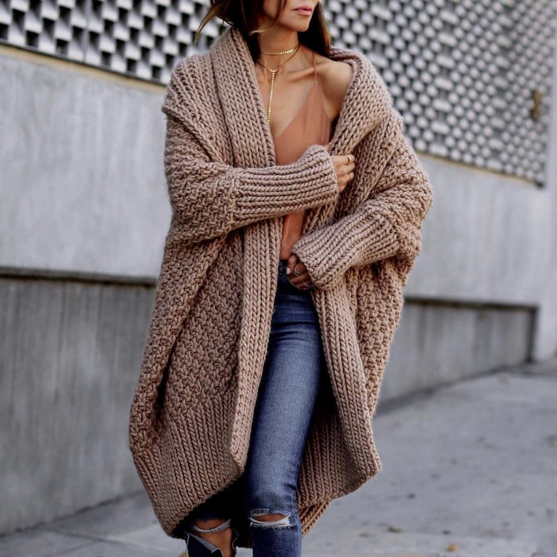 Длинные теплые мохнатые кардиганы носятся как верхняя одежда. Вам не нужно беспокоиться о куртке или пальто. Что, безусловно, никогда не выходит из моды, это оригинальный орнаментальный рисунок. Горошек, звезды или модные полоски…