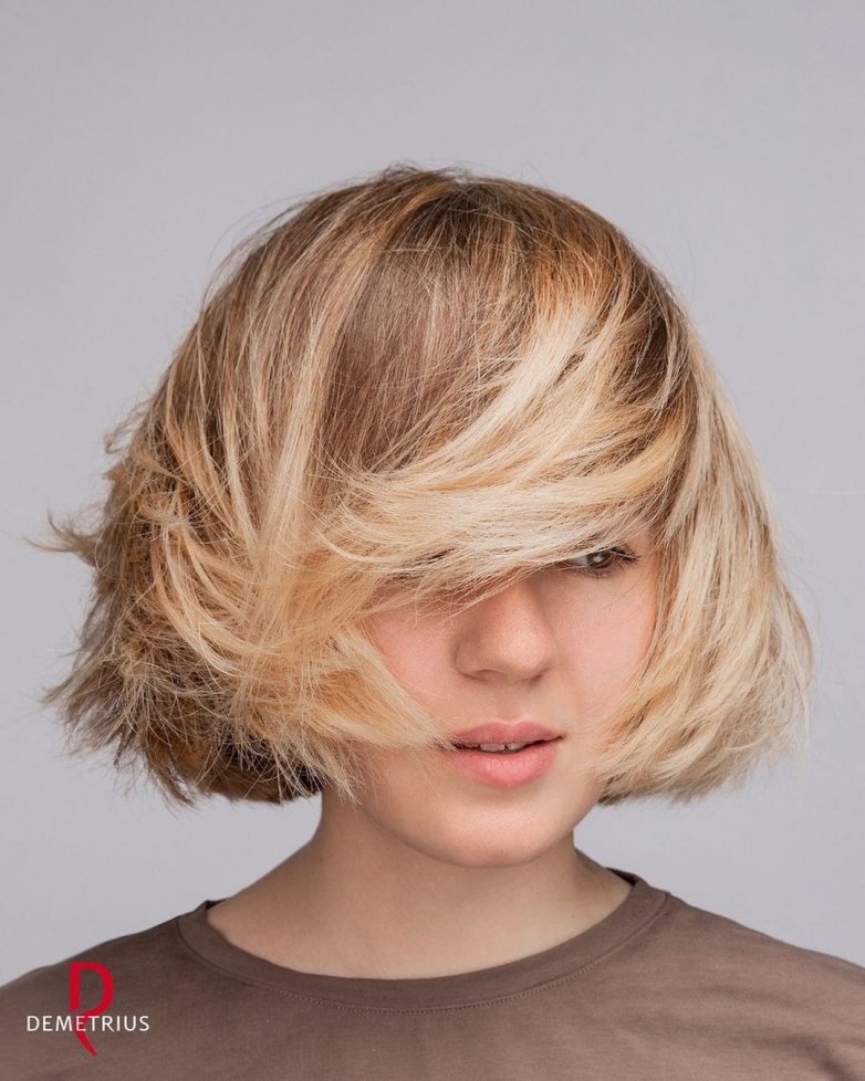 Многослойные короткие стрижки являются беспроигрышным выбором для женщин с тонкими ослабленными волосами. Короткий каскад располагается по всей голове, красиво выглядит после укладки, напоминая объемную шапочку. При укладке женщины подворачивают концы волос как наружу, так и внутрь, создавая нарочитую небрежность прическе, что значительно молодит образ.