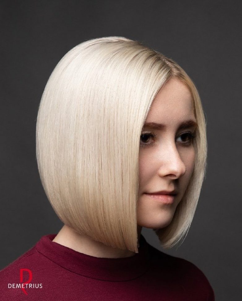 Этот вид стрижки является градуированным и по форме напоминает фасолину, сужающуюся к шее. Благодаря стрижке прядей под разными углами достигается потрясающе эффектная прическа.
