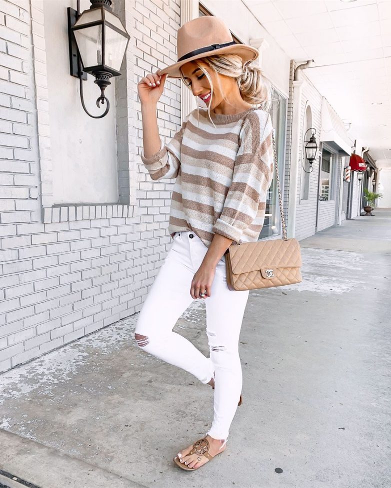 Массивные свитера пастельных тонов также помогут спрятать не совсем подходящую форму белых джинсов. Голубоватые или розоватые оттенки нежно подчеркнут Вашу чуткую натуру, особенно в совместимости с джинсами белого цвета. Не стоит подбирать тёмный или слишком яркий вверх. Лучшим покажется тот образ, если небольшие полоски на нежной кофточке будут сочетаться с обувью.