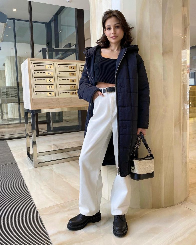 Укороченные стеганые пальто молодежь любит носить с бейсболками или минималистическими бини, создавая спортивный лук.