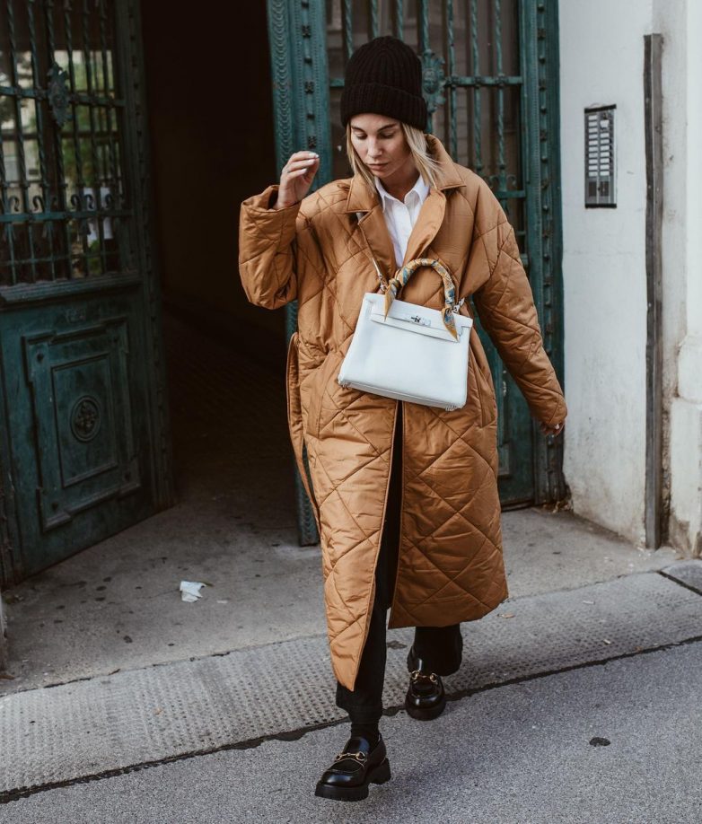Стеганые модели оверсайз, дополненные вязаной чалмой, создают привлекательный образ, особенно дамам с восточным типом лица.