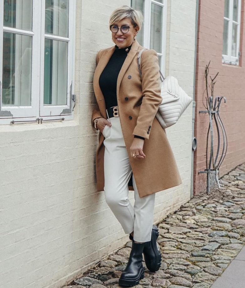 Черная или бежевая водолазка составит стильный ансамбль в дуэте с бежевым или серым пальто в стиле оверсайз. Белые водолазки подойдут к любому светлому пальто.