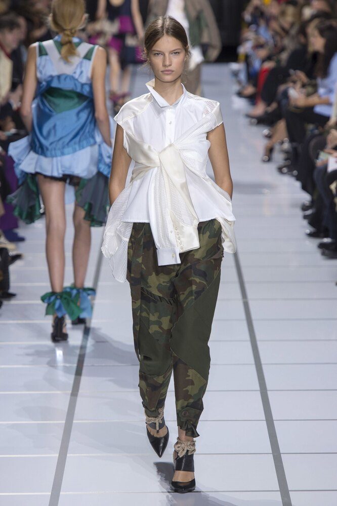 Этот тренд остается с нами уже много сезонов. Просто носить рубашку с повязанным поверх свитером — скучно. То ли дело надеть сразу две белые рубашки! Например, надеваете ту, что без рукавов, а вторую повязываете так, как вам нравится: с плеча и из-под руки, как на показе Sacai, на пояс или просто накинув на плечи.