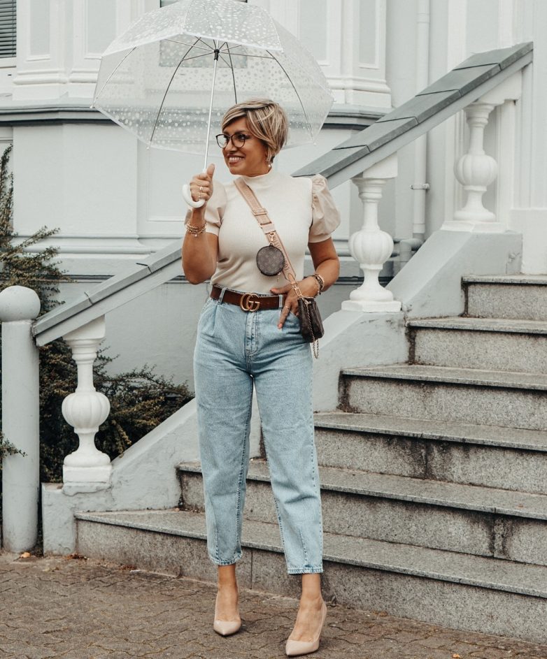 В гардеробе каждой возрастной женщины найдутся джинсы. Весной, обновляя гардероб, следует отдать предпочтение джинсам классического кроя или длины 7/8, зауженным книзу. Темные джинсы скроют недостатки фигуры, отлично сочетаясь с кроссовками, ботильонами, ботинками.