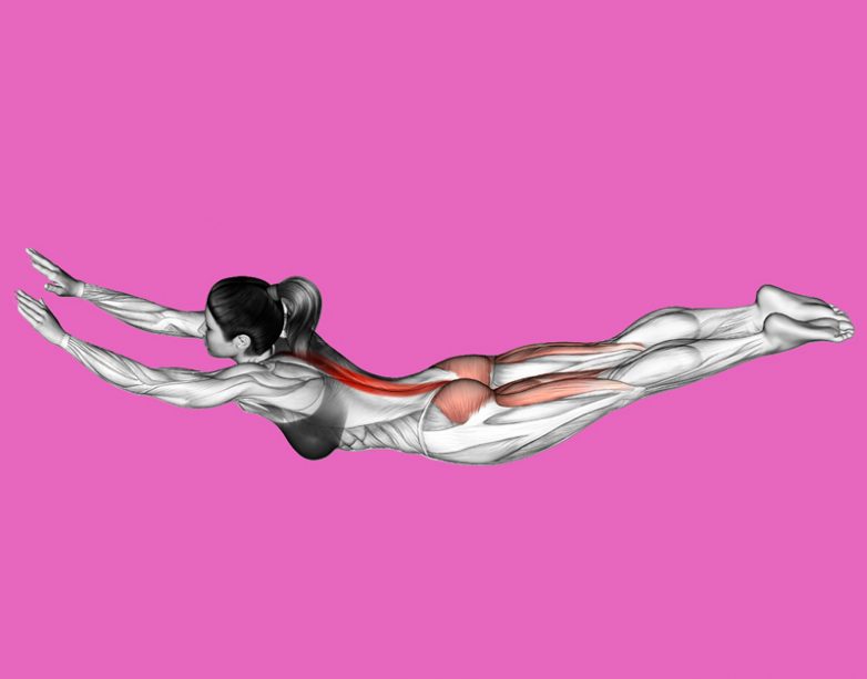 Тренирует заднюю область тела. Удерживаем в усилии как спину и ягодицы, так и мускулатуру живота, поясничный прогиб слабо выражен.