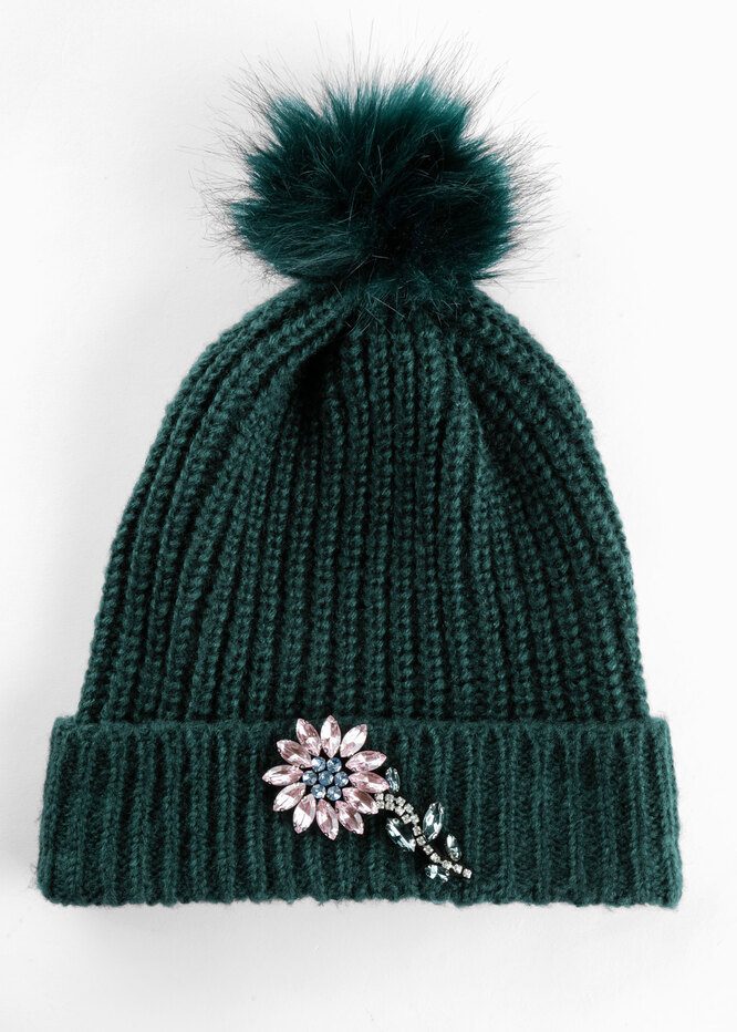 Это может быть классическая бини или шапка с небольшим меховым помпоном. Желательно, чтобы на ней не было больше никаких декоративных деталей, тогда она будет гармонично сочетаться как с элегантным пальто, так и с пуховиком.