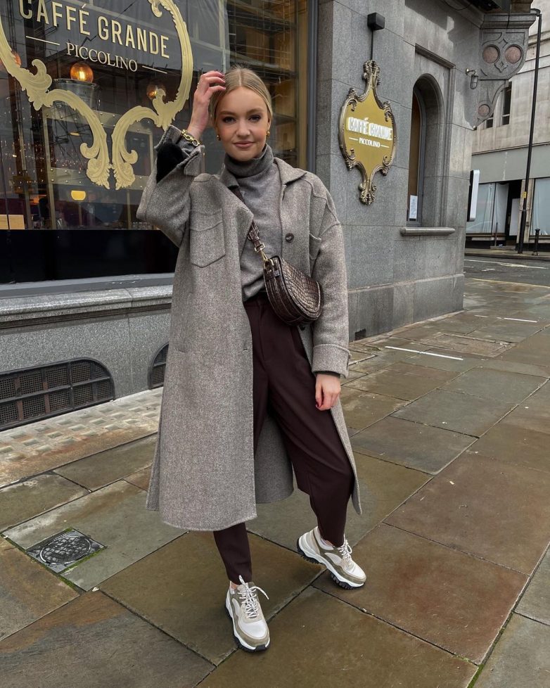 Хорошо сочетаются с серой водолазкой брючные пары коричневого цвета в узкую серую полоску.
