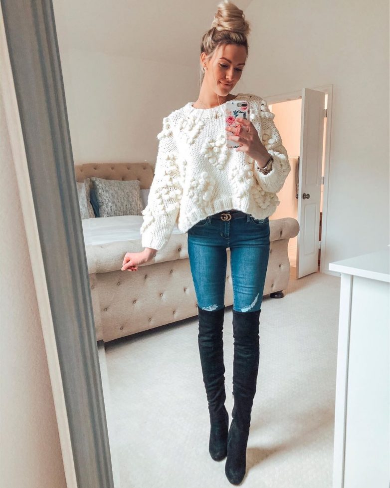 Самый простой способ носить сапоги до или выше колен – это джинсы скинни. Вот почему многие женщины готовы ходить в этом комбо везде, от супермаркета до вечеринки. Комбинируя высокие сапоги с джинсами, подумайте о цвете. Вы хотите, чтобы они сочетались с ними или работали в противофазе? Хороший выбор – черная или бежевая пара и классический деним цвета «индиго».
