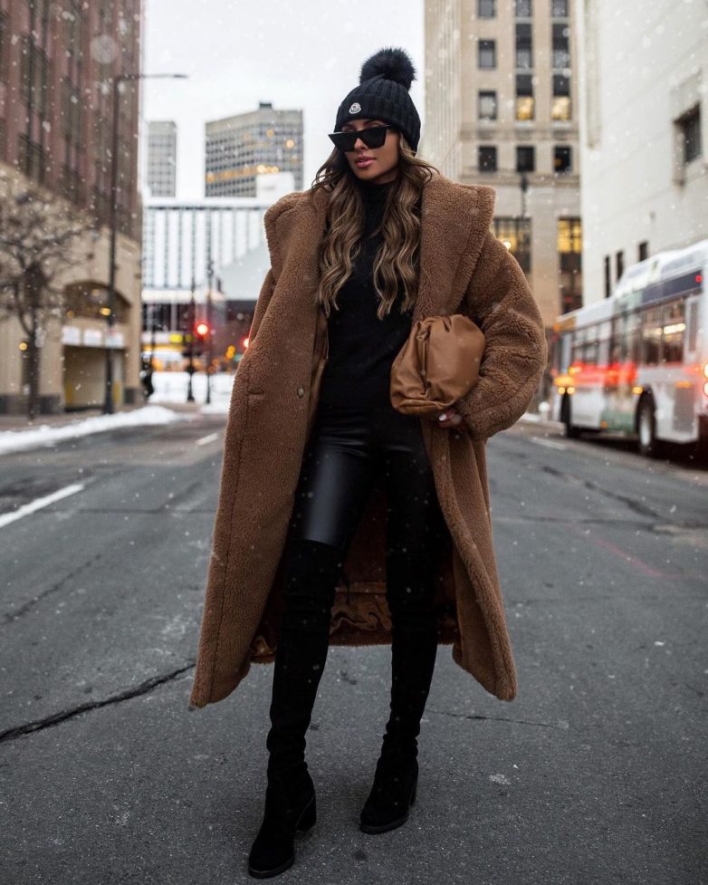 Ботфорты на низком ходу можно носить с укороченной курткой любого фасона, от косухи до плюшевого жакета. Каблуки в этом случае более капризны и подойдут не ко всем моделям – образ может уйти в вульгарность. Лучше всего будут смотреться классические авиаторы-дубленки, бомберы oversize и объемные пуховики. Цветовая гамма должна быть неяркой, чтобы смягчить дерзость сочетания.