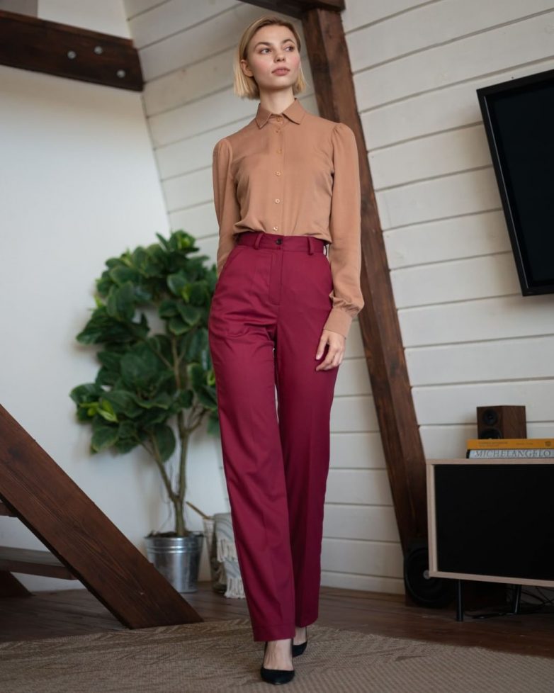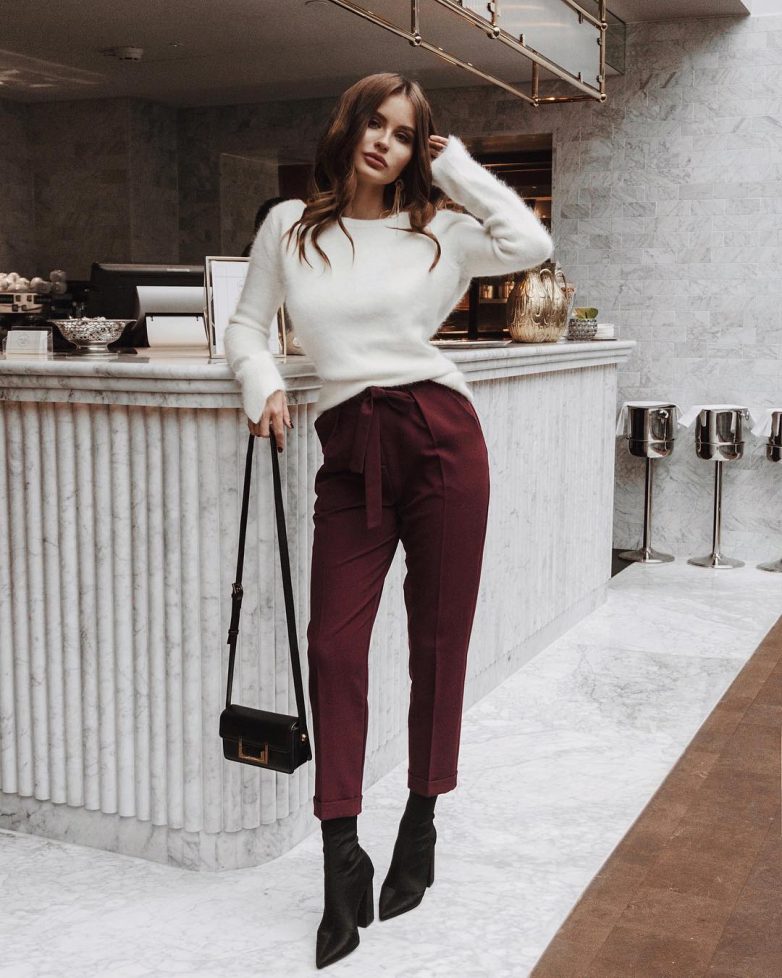 Даже при наличии самого строгого офисного дресс-кода всегда достойно смотрится наряд из брюк цвета бордо и белой рубашки мужского стиля. Дополнив лук свободно повязанным ярким шейным платком, и лодочками на высокой шпильке вы будете выглядеть сногсшибательно.