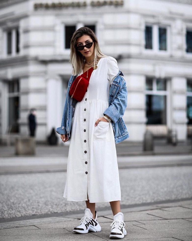 Для городского стиля подойдет комбинация белого платья с модной джинсовкой. Образ будет простым, но в то же время очень привлекательным. В качестве обуви можно выбрать удобные сапожки на плоской платформе, кеды или босоножки.