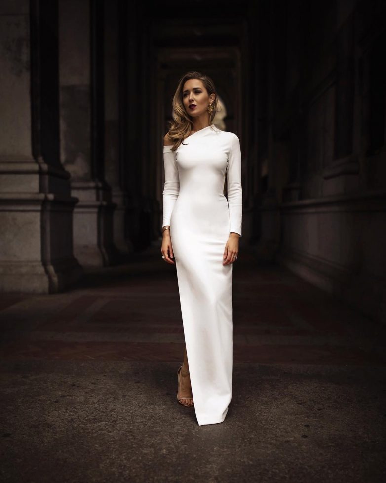 Платье-футляр в белоснежном цвете выглядит замечательно на девушке с идеальными пропорциями. Модель часто используют для работы или похода в ресторан;
