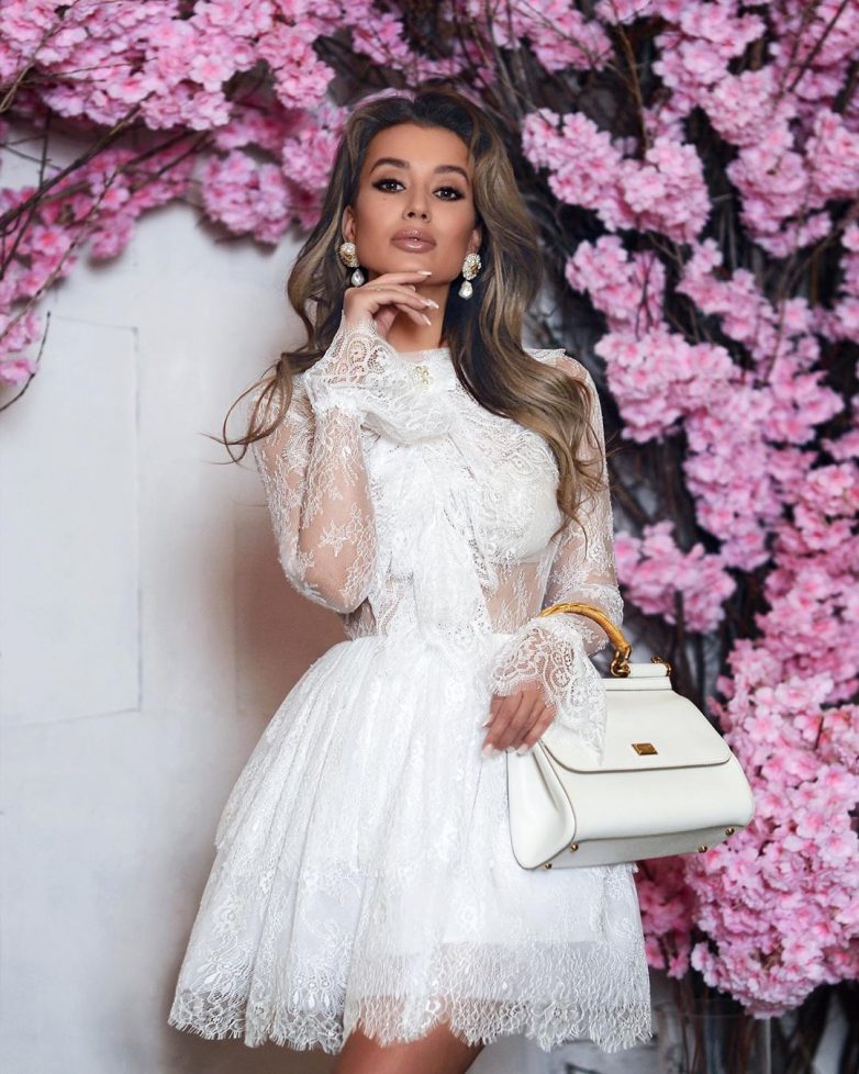 Белоснежный цвет не только добавляет образу внешнюю чистоту, но и может бледнить кожу. Стоит разбавлять лук не только одеждой других оттенков, но и стильными аксессуарами;