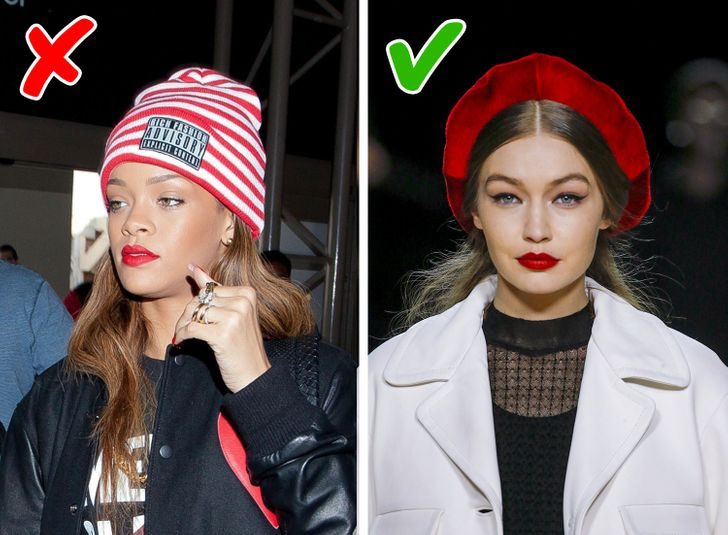 Эффектно подчеркнут лицо береты (как на фото с Джиджи Хадид), тюрбаны, шапки-ушанки. Причем «уши» совсем не обязательно убирать назад. Можно даже немного прикрыть лоб, это не нарушит пропорции. Хуже будут выглядеть высокие шапки или папахи. Они сделают лицо еще более вытянутым: например, Рианна на фото выше удлинила лицо.