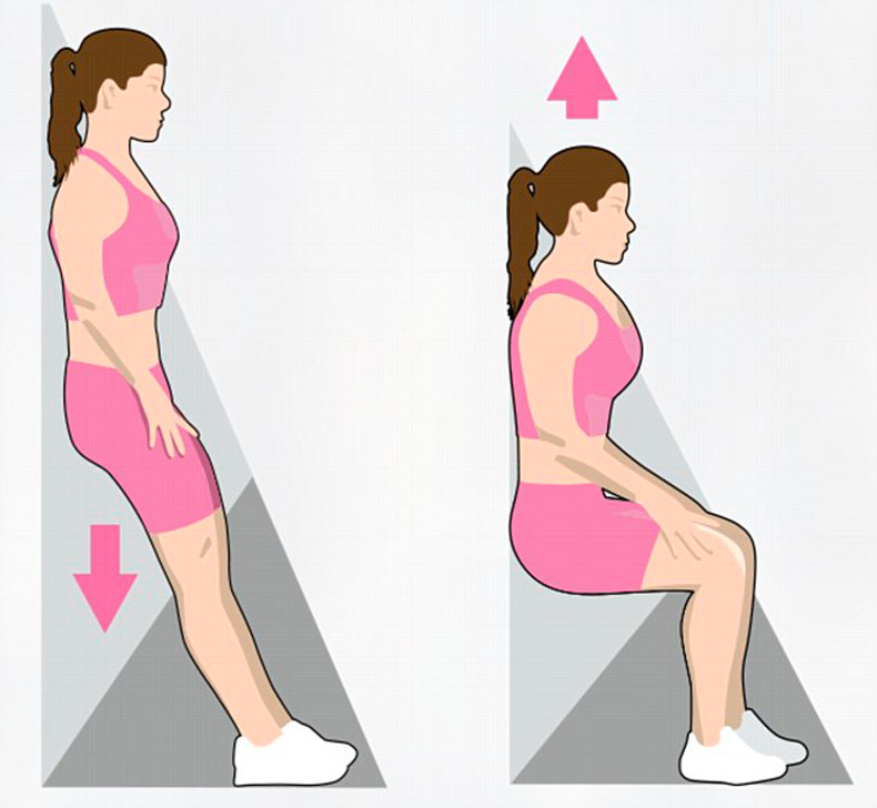 3. «Стул-невидимка». Тренируем икроножные, бедренные, ягодичные мышцы и плечи