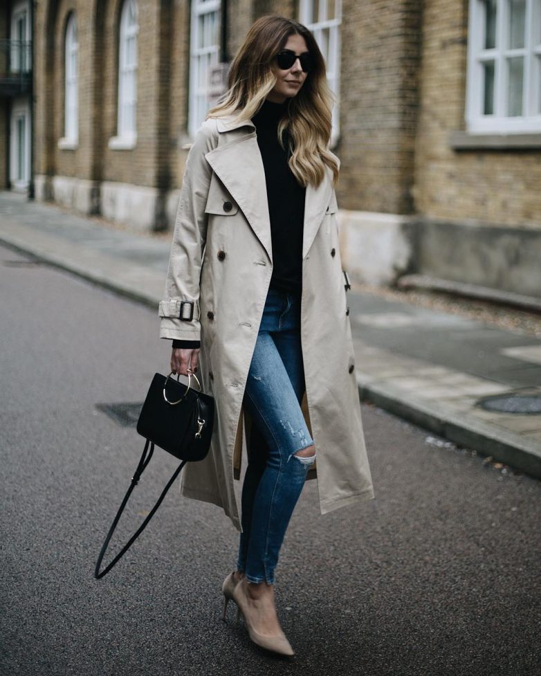 Весной данная вещь выглядит особенно женственно и нежно. Элементами классического тренча являются такие: разрез сзади, отложной воротник. Современные модели выпускают без пояса. Главное не ошибиться в выборе цвета, который будет уместен всегда. Хороша любая качественная обувь классического кроя нейтральных цветов. Рекомендуем предпочесть обувь на платформе: и стильно, и удобно.