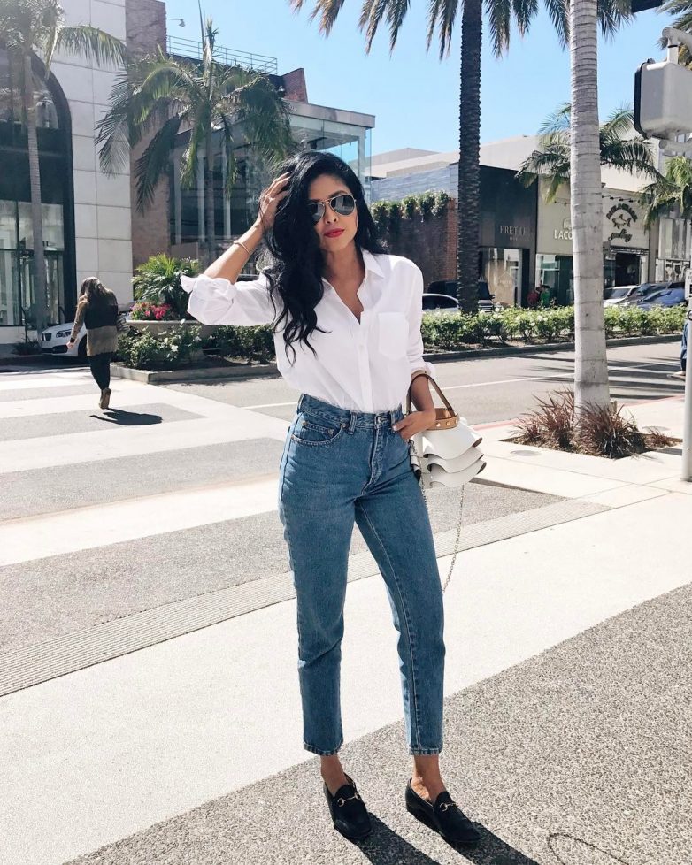 7. Белая рубашка и джинсы – это уже классика. Делают образ более неформальным лоферы и необычная сумка.