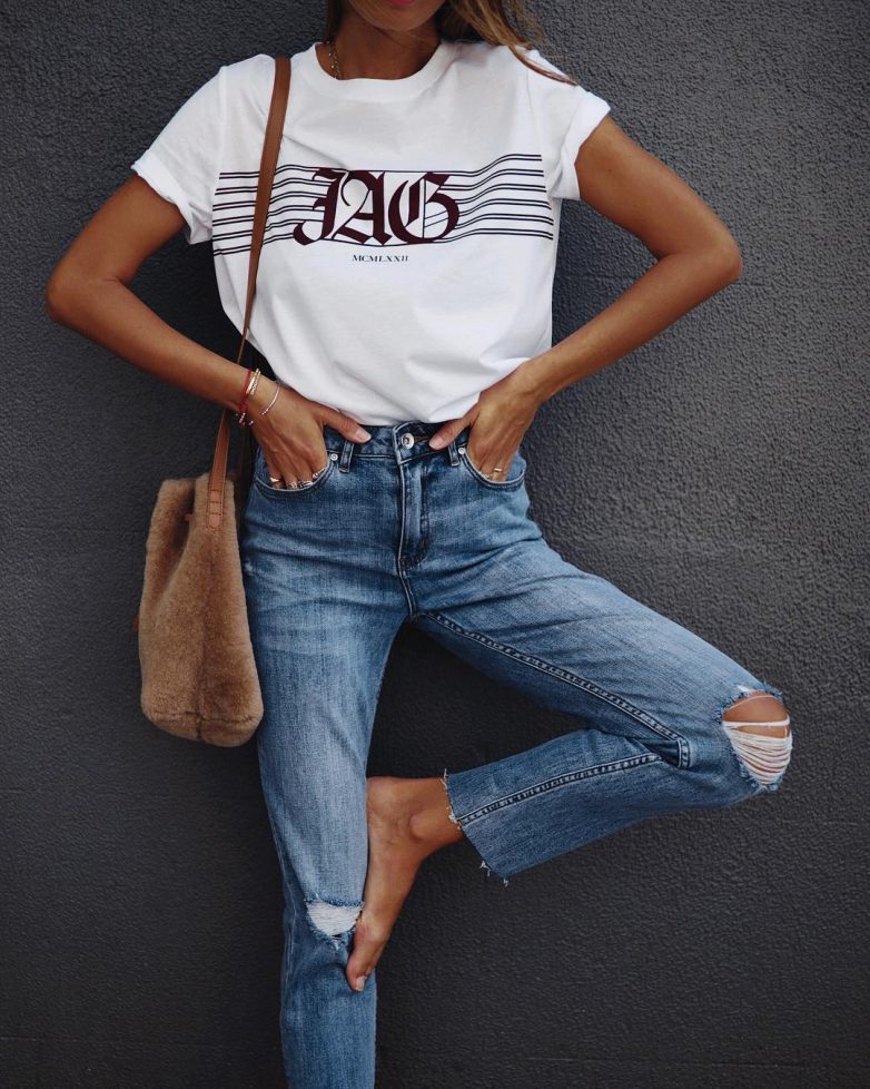 Рваные джинсы и футболка отлично сочетаются. Джинсы могут быть самых разных фасонов. В такой одежде женщина будет выглядеть свободно и немного небрежно, но, в зависимости от стиля футболки, образ можно подкорректировать в сторону женственности и романтичности.