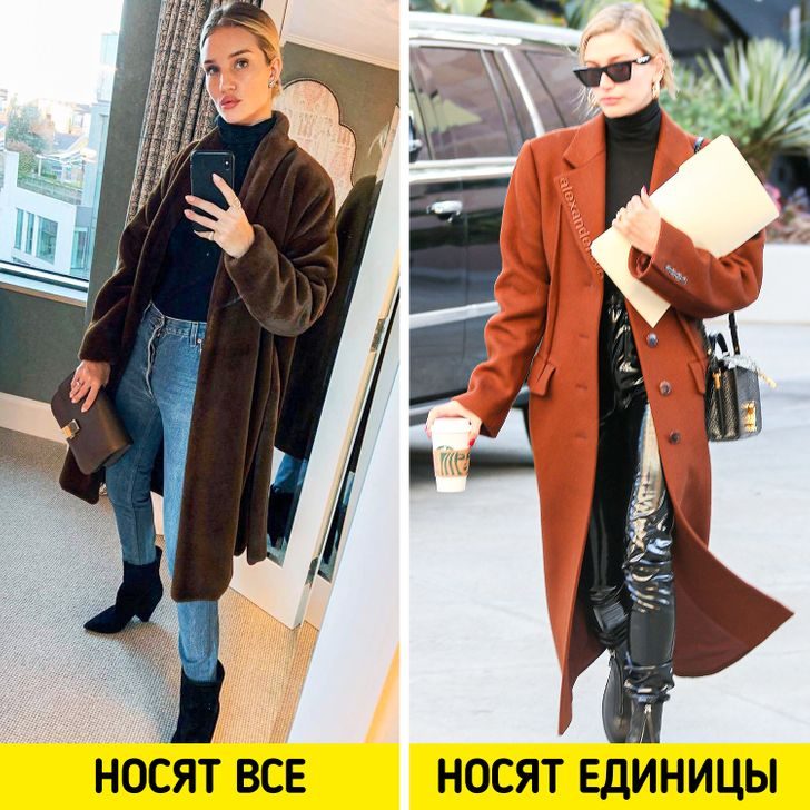 Кстати, говоря о классике, водолазка вполне впишется и в полноценный офисный образ. Лучше всего для этого подходят монохромные брючные костюмы. Как вы видите на фото, Ирина Шейк создала несколько мужественный образ в черном цвете с ярким акцентом в виде сумки. Роузи Хантингтон-Уайтли же, наоборот, сделала контрастным пятном саму водолазку.