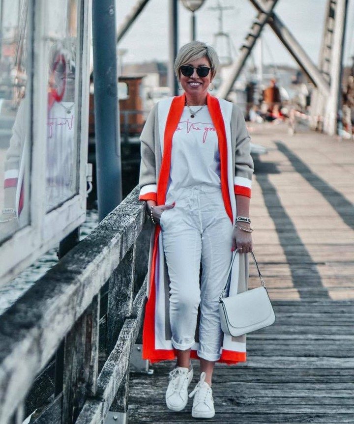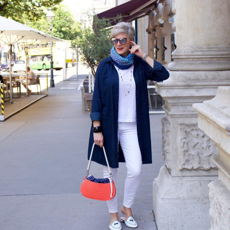 Белый в этом году будет на пике своей популярности. А женщинам за 40 советуем особенно пристально обратить внимание на этот цвет, ведь он способен невероятно преобразить ваш образ и сделать его более молодым и свежим. Достаточно надеть белые свободные брюки прямого кроя и добавить к ним белую футболку, майку или блузу. Невероятно будет лук смотреться, если вы его разбавите удлиненным жакетом, туфлями на каблуке, принтованным шарфиком и объемной сумкой. При этом если говорить о аксессуарах, то советуем свое внимание обратить на круглые серьги и черно-белую бижутерию для украшения вашей шейки.