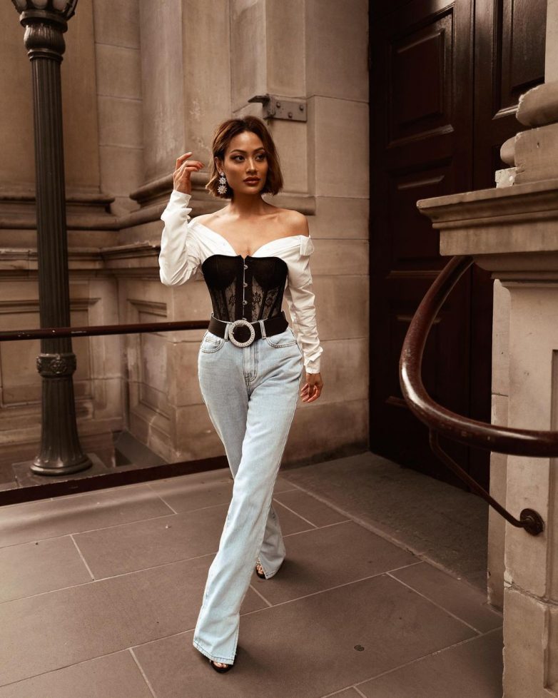 сочетание блузки и широкого ремня в стиле бохо или хиппи;