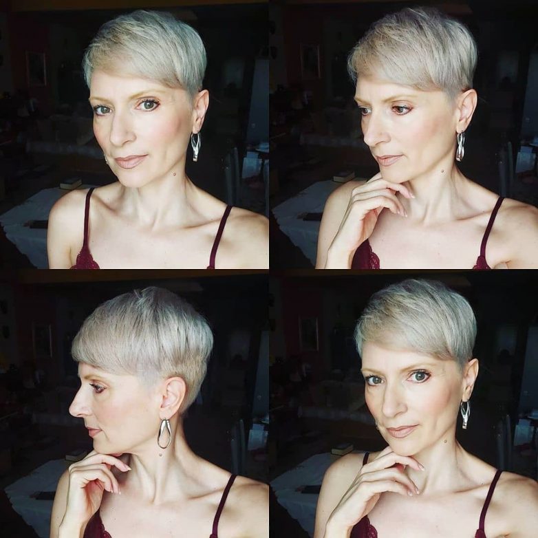 Пикси имеет массу разных видов, которые подбираются под параметры и вкус женщины. Если в 40-50 лет хочется чего-то нового и необычного, то можно сделать пикси с выбритыми элементами, для любительниц классики и женственности подходит классический вариант пикси с длинной челкой.