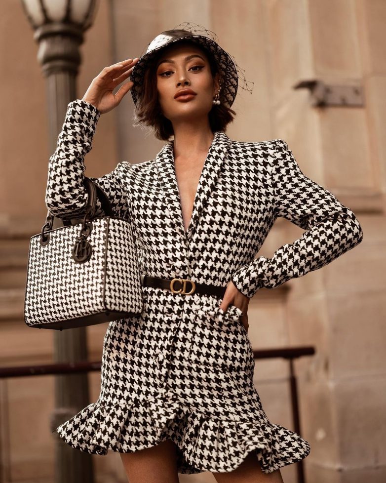 Еще более выразительно и стильно выглядит черно-белый принт. Например, модная клетка или костюмный рисунок «гусиная лапка» в черно-белом контрасте всегда в моде. Можно выбирать даже самое соблазнительное платье длины миди с воланами, но за счет традиционной расцветки образ все равно будет строгим и лаконичным.