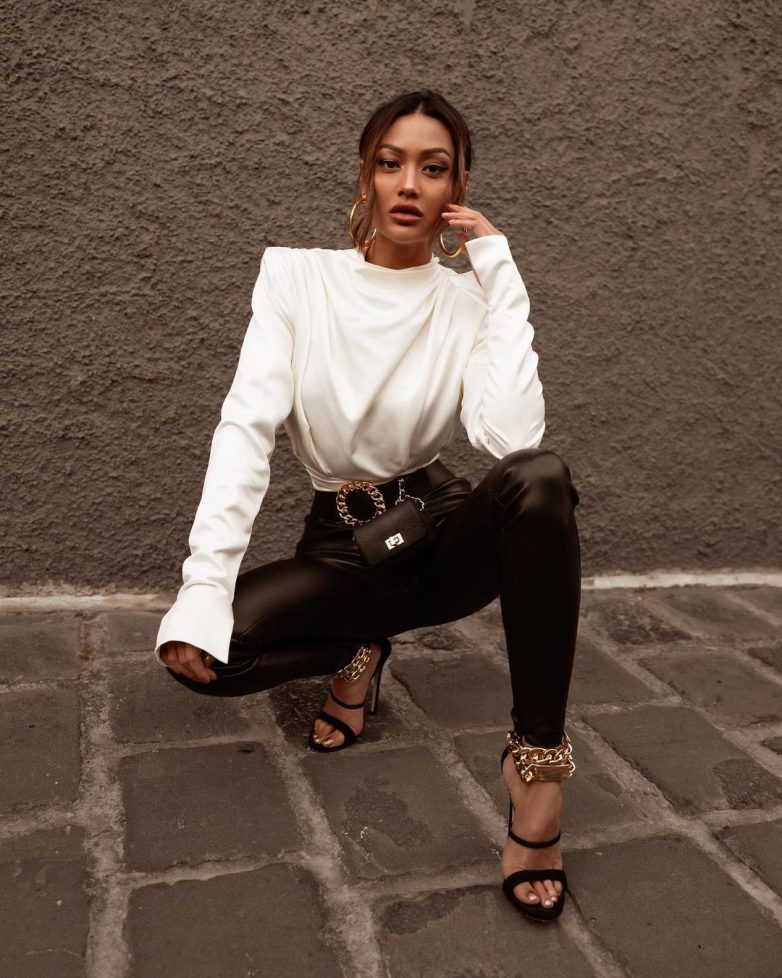 Белый верх и черный низ – строгий дресс-код для деловых дам. Если выбрать соблазнительную блузку и обтягивающие брюки, то наряд отлично подойдет для торжественного образа. Очень кокетливо смотрятся стильные кожаные брюки в черном цвете совместно с белоснежной водолазкой – это модный образ на каждый день весны. Также можно выбрать обычные черные джинсы и скомбинировать с нежной майкой в белоснежном цвете на тонких бретельках.