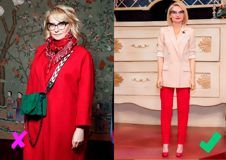 Красный — яркий, но грубый цвет, который каким-то необъяснимым образом концентрирует всё внимание на лице. Затемняет все ямки и высветляет все выпуклости на лице. Стоит выбирать более приглушенные, нежные оттенки, либо использовать красный на нижней части образа. Тогда образ будет выглядеть свежо и элегантно. А если вы хотите быть яркой, вам помогут золотистые оттенки.
