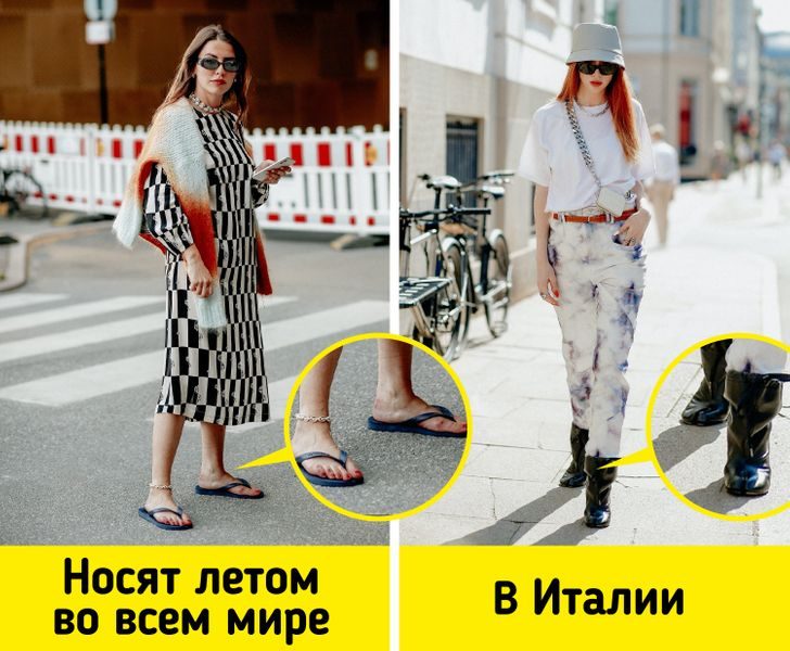 Итальянки часто выбирают довольно теплые и закрытые сапоги и ботильоны даже в летнюю жару. А вот открытая обувь типа кроксов и шлепанцев у них под запретом за пределами бассейнов и пляжей. Кроме того, они вряд ли выберут туфли из искусственной кожи (отличать ее от натуральной они умеют с первого взгляда) — скорее, наденут простые кроссовки или конверсы. А еще итальянки недолюбливают шпильки, но часто ходят по брусчатке на довольно высоких каблуках или на модной сейчас танкетке.