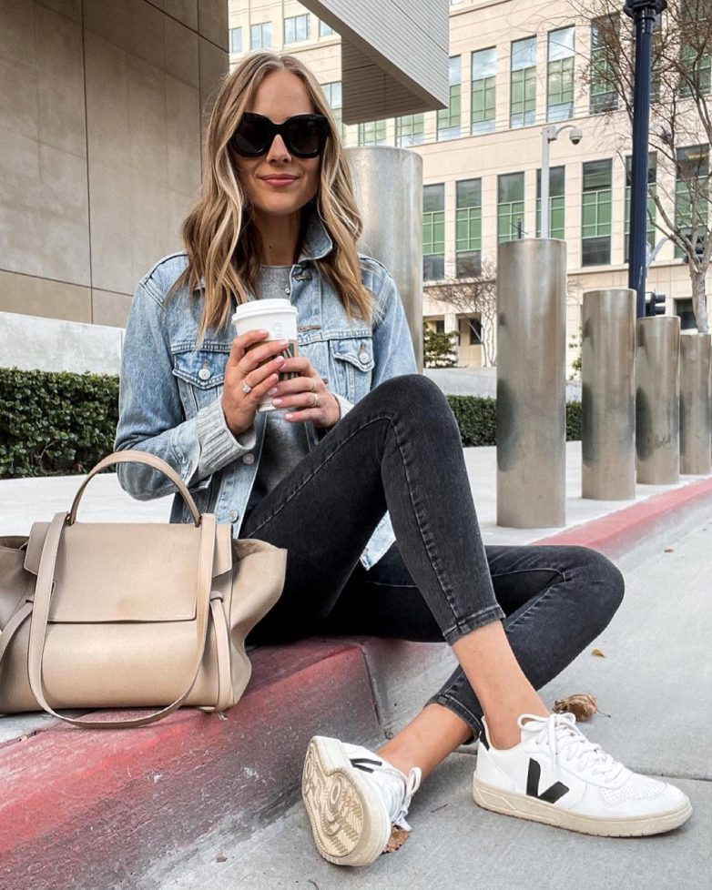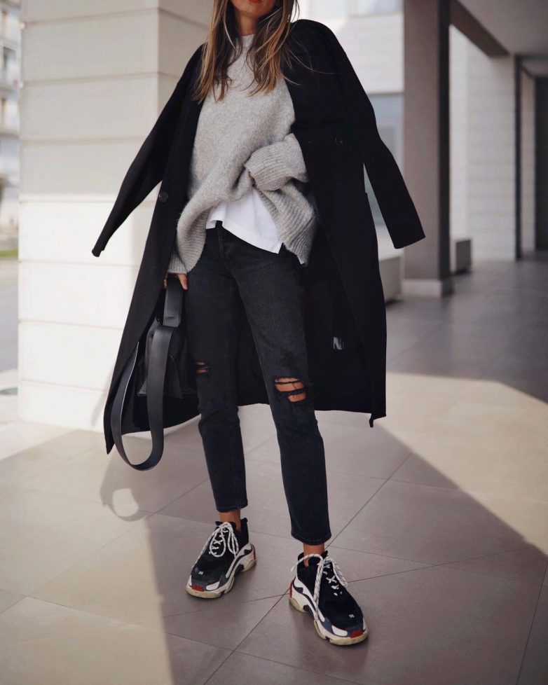 Популярный стиль спорт-шик собирают при помощи рваных черных джинс, стильного пальто и комфортных кроссовок. Обычно такой образ подходит сильным и ярким модницам, которые готовы к удивленным взглядам окружающих их людей. Пальто при этом может быть не только черного цвета, но серого или бежевого оттенка. Если кроссовки совместно с пальто для вас слишком экстравагантно, тогда в качестве обуви можно выбрать не менее удобные лоферы.