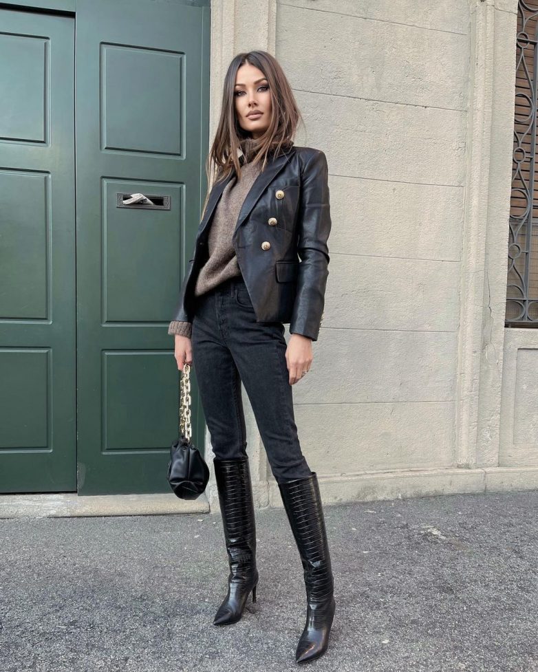 Для создания дерзкого образа в стиле кэжуал лучше всего подобрать к черным джинсам стильную кожаную куртку. Косухи – это самый любимый фасон верхней одежды у многих модниц. Под кожанку можно надеть объемный свитер или водолазку. Чтобы образ был полноценным и подчеркивал идеальный вкус дамы, стоит выбрать кожаную обувь. Подойдут не только ботфорты, высокие сапоги на каблуках, но и ботинки на низком ходу или грубые модели.