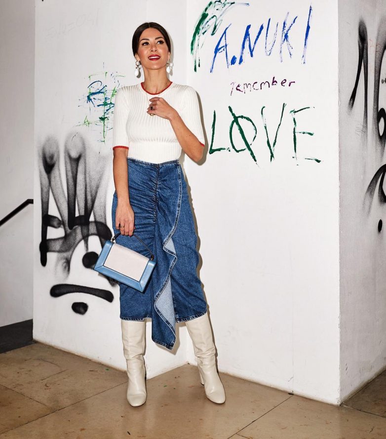 Джинсовая юбка в определенном фасоне позволяет придумывать образы для каждого сезона. Поэтому можно смело выбирать ту обувь, которая больше всего вам подходит. С миди юбкой из денима гармонично выглядят сапоги с высоким голенищем, грубые ботинки и другая обувь на каблуке или платформе.