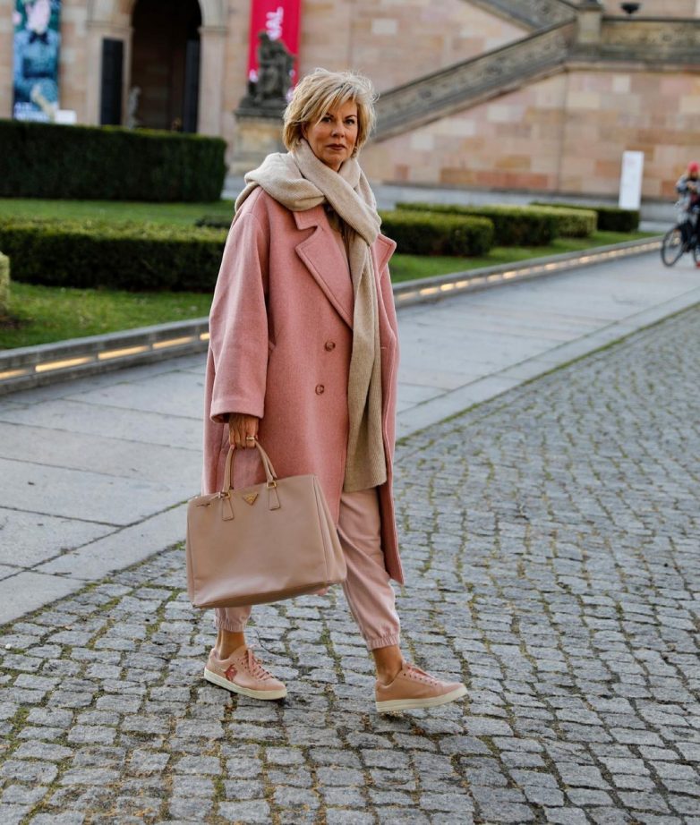 Уличный стиль – это возможно сочетать элегантные классические вещи совместно со спортивными деталями. Для весеннего модного образа женщине 40-50 лет отлично подойдет лук с кедами, спортивными укороченными брюками и пальто в прямом крое. Если выбрать не традиционный оттенок, а розовый монохром, то модница завоюет внимание всего окружения.