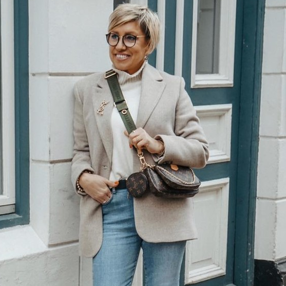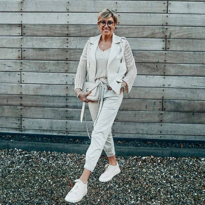 Именно бежевый цвет советуют всем дамам в возрасте 40-50 лет. Он подходит для создания деловых, вечерних и повседневных аутфитов. Если вы решили собрать образ в уличном стиле, то бежевый цвет в обычных вещах позволит омолодиться на несколько лет. Например, сочетание свободных брюк, вязаной кофточки и стильной безрукавки совместно с белыми кедами – это простой, но одновременно стильный лук для дамы 40-50 лет.