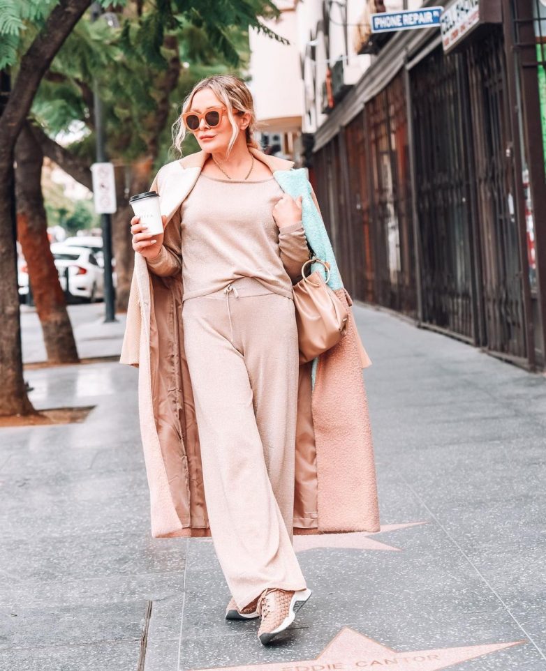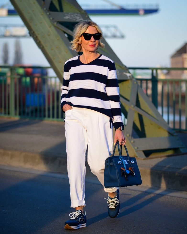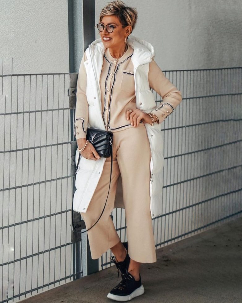 Для повседневного образа женщинам 40-50 лет в базовый гардероб стоит добавить несколько спортивных вещей. Брюки спортивного стиля совместно с удобной кофтой или худи можно выбрать для прогулки по городу или отправиться в них на пикник. Спортивный стиль не портит образ зрелой дамы, наоборот, очень освежает.