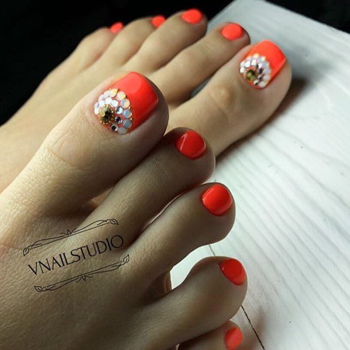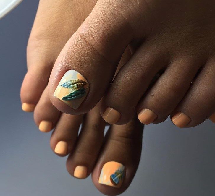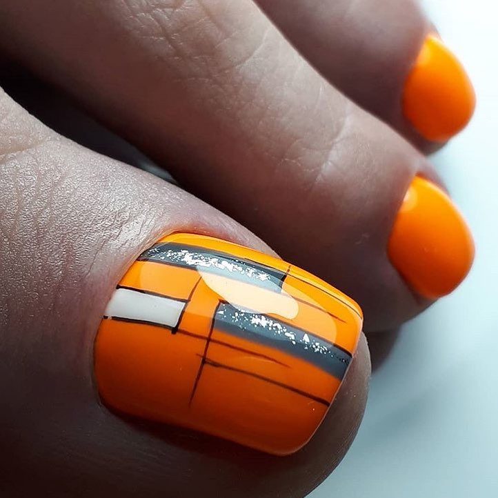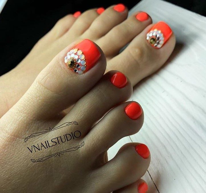 Оранжевый педикюр с рисункомВы также можете выполнить оранжевый педикюр с рисунком.