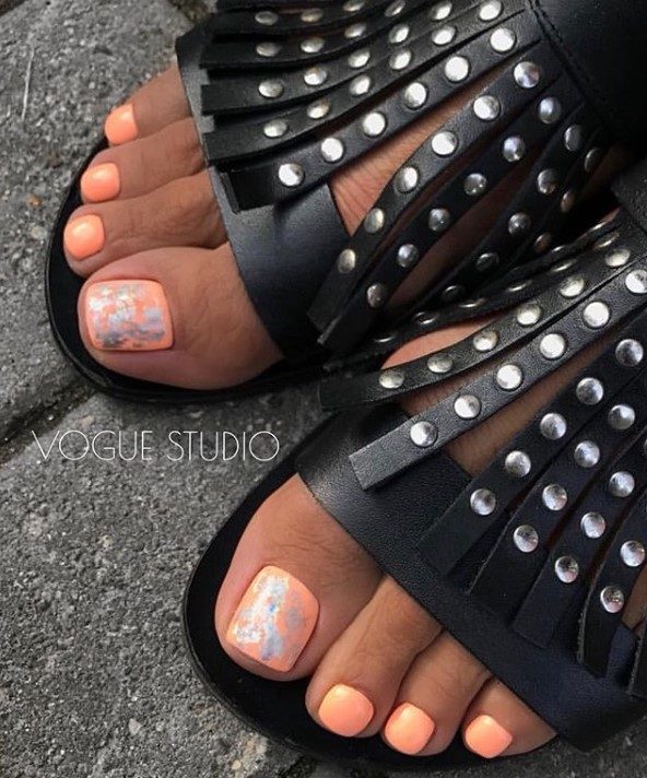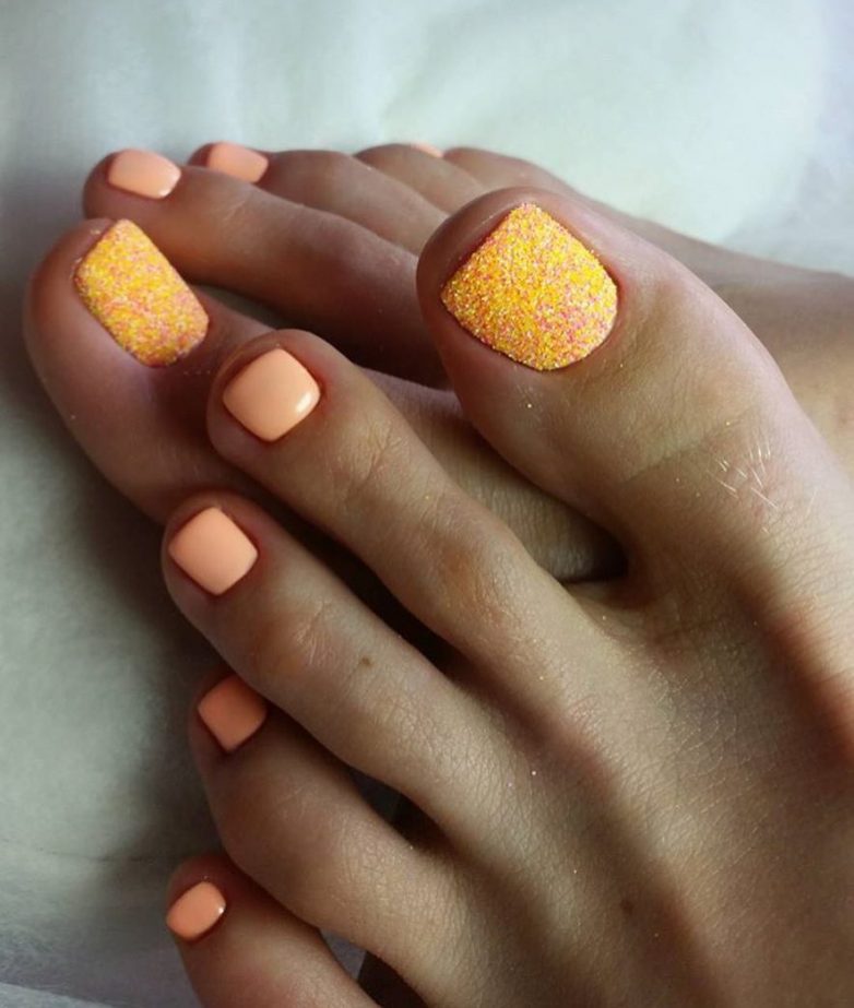 Чтобы ваш педикюр выглядел стильно и современно, обратите внимание на стилистику фен-шуй. Педикюр в стилистике фен-шуй выполняется с помощью нанесения на ногти разных цветов, которые гармонично между собой сочетаются. Если вы решили сделать оранжевый маникюр, нанесите представленный тон на один или несколько пальцев, а остальные покройте золотым, желтым, белым, черным, розовым, голубым или серебряным лаком. Чтобы ваш педикюр смотрелся максимально интересно, можно использовать не только глянцевый топ, но также и менее популярный, но более богатый матовый.