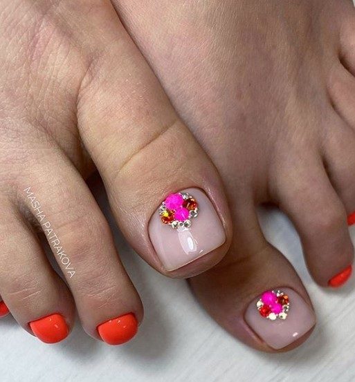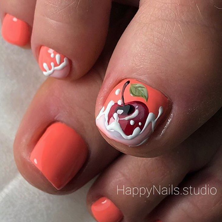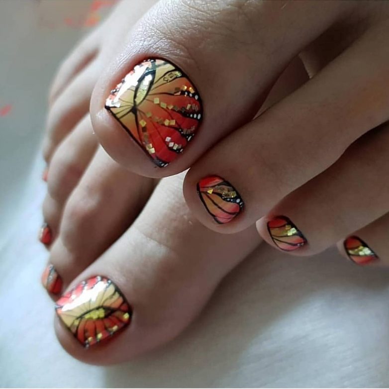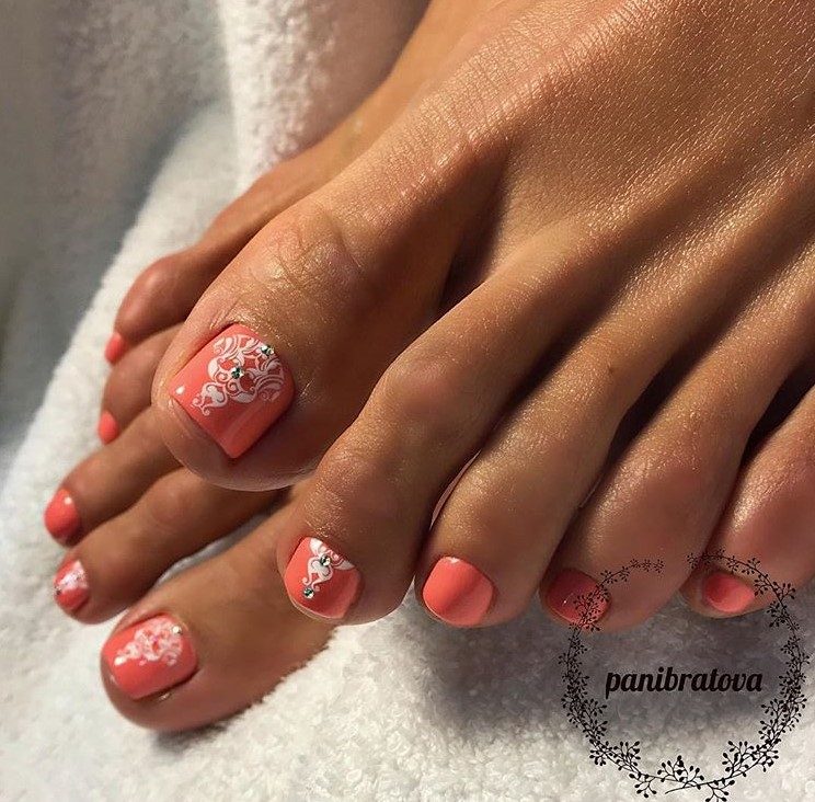 При создании летнего нейл-арта обратитесь к тематическим узорам. Красиво на ножках будут смотреться интересные цветочные мотивы, бабочки и другие из мира насекомых и даже морская тематика. Более нейтральный узор создается с помощью геометрических фигур, абстракции, а также модного в настоящее время анимастичного принта.