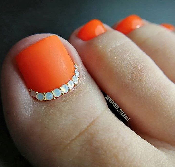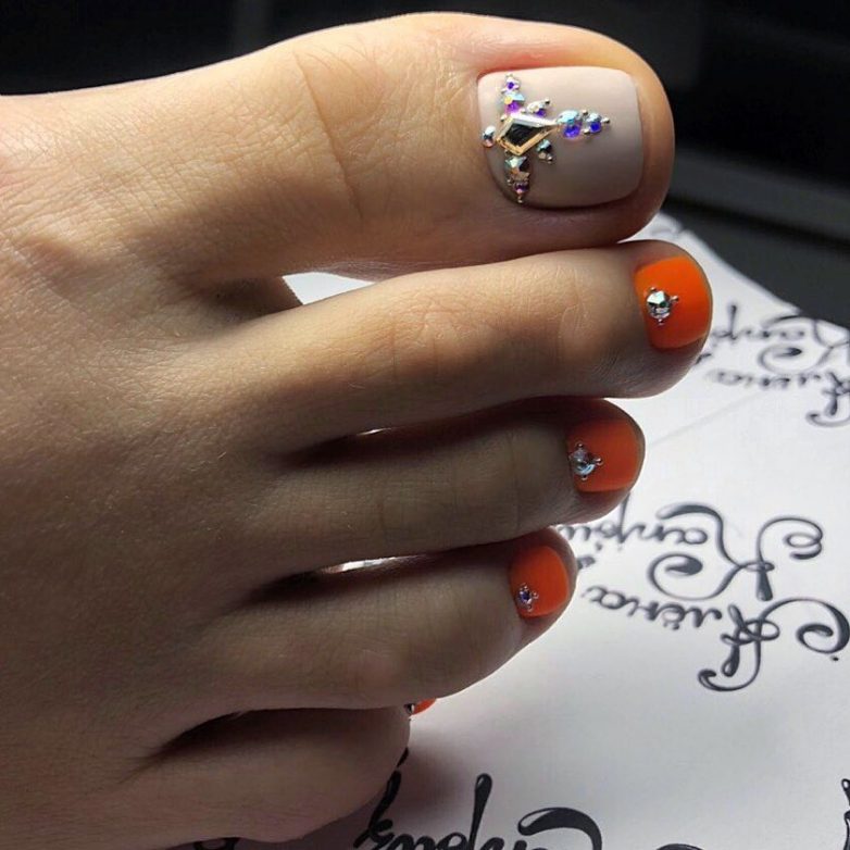 При создании оранжевого педикюра советуем не бояться экспериментировать даже с техниками. Омбре, френч или эффект голого ноготка чаще всего используются в нейл-арте специалистами. Причем техники вполне удачно можно дополнить не только декором, но и рисунками, для получения действительно интересного и незабываемого педикюра.