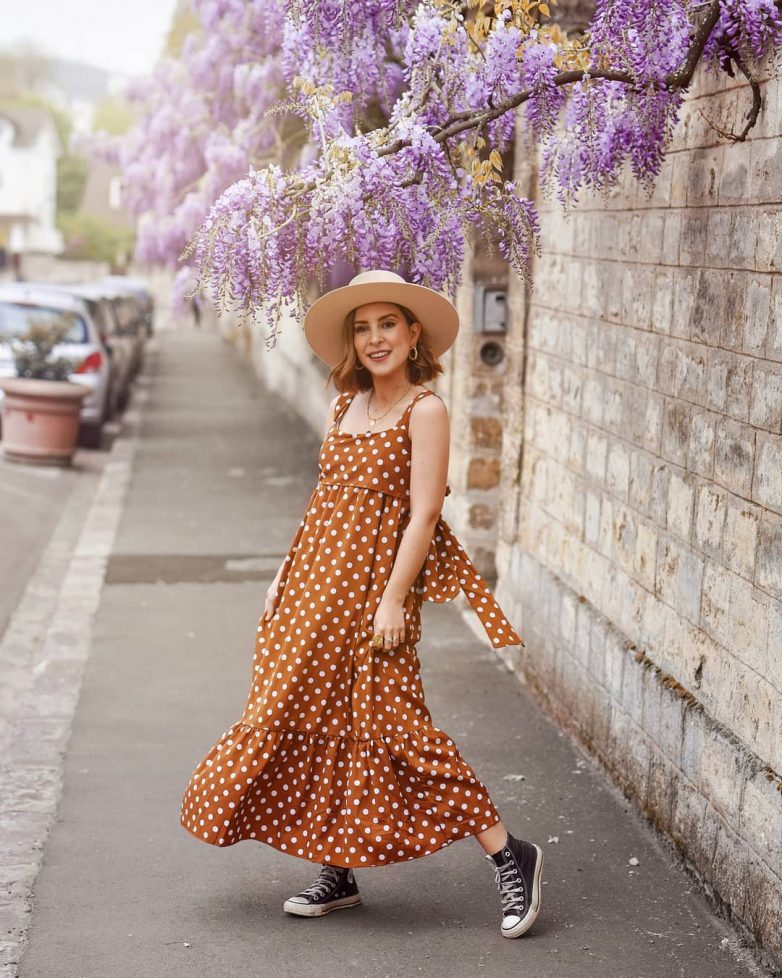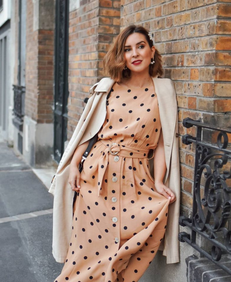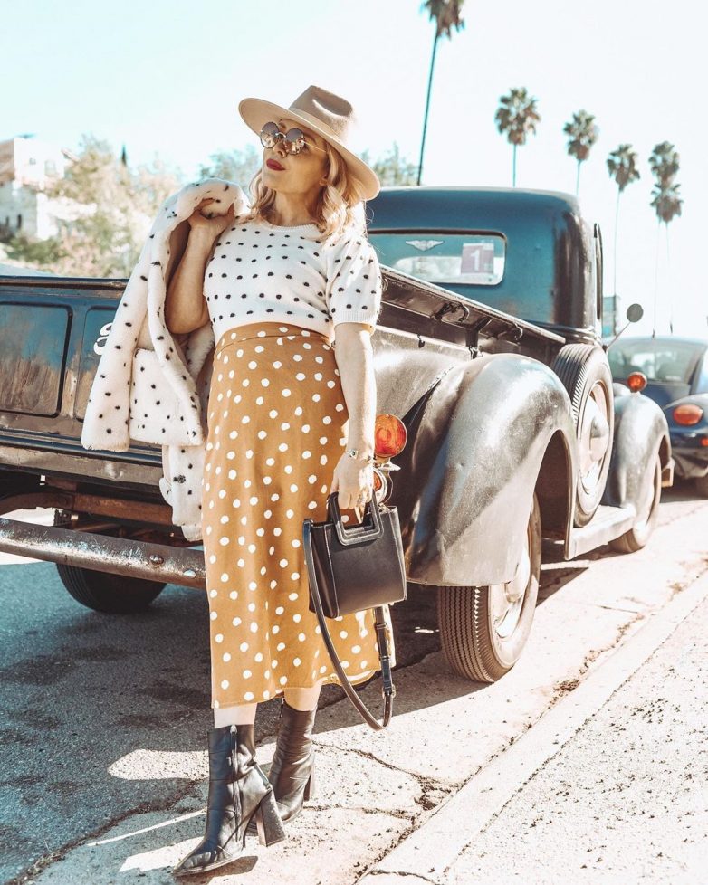 Принт горошек можно сочетать со многими вещами. Горошек присутствует во многих предметах гардероба. Для более спокойного и не вычурного образа лучше всего выбрать одну вещь в горошек и дополнить его однотонным верхом или низом.
