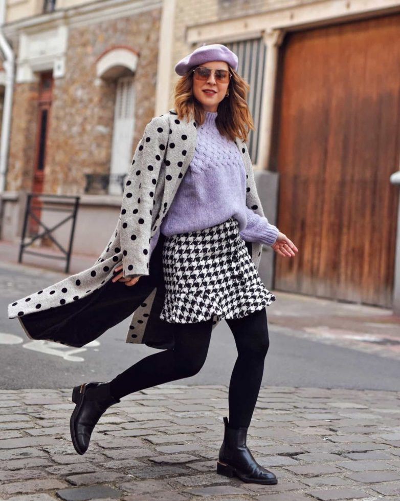 Тотал лук в стильный горошек – это вариант смелых и уверенных женщин. С таким луком вы получите образ игровой и женственной дамы, которая умело играет с фасонами и красками. Обычно наряд собирают из верхней одежды в горошек, в сочетании со стильными юбками или брюками и таким же тоном блузками. Экстравагантность и уникальность будет гарантирована даме в тотал луке с горошком.