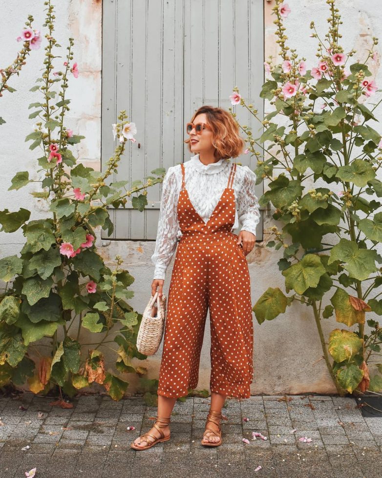 Если женщина хочет более романтичный образ, то отлично смотрятся комбинезоны из легкой ткани с воланами и рюшами, и открытыми плечами. Из обуви выбирают удобные кроссовки или любые туфли на каблуке, но и обычные мокасины будут дополнять образ кокетки.