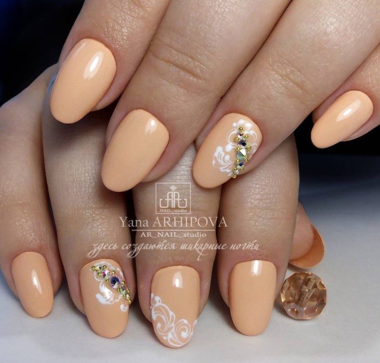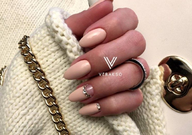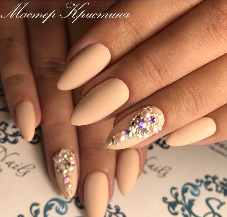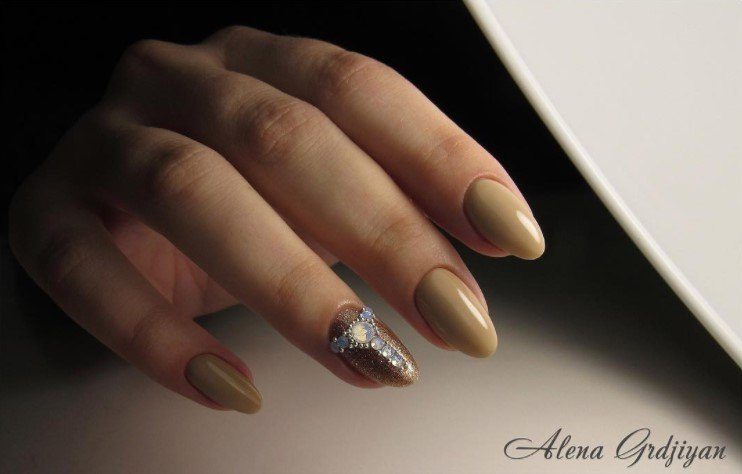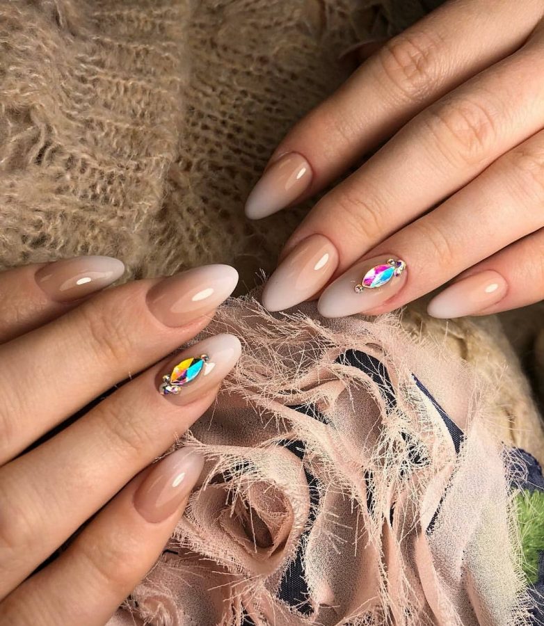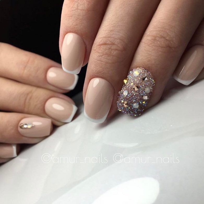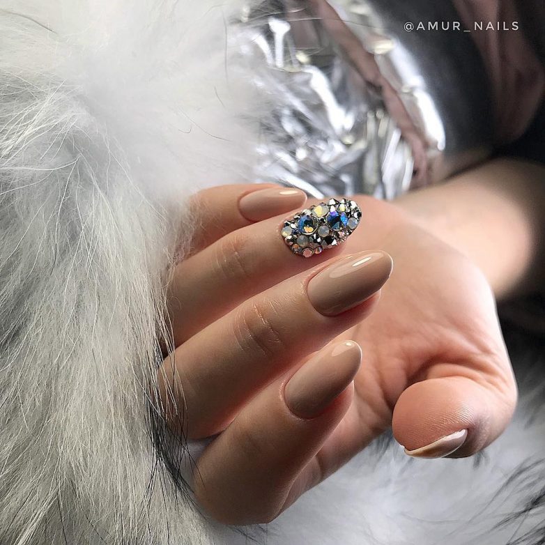 Бежевый маникюр настолько универсален, что вы с легкостью можете позволить себе сочетать его с любым дизайном, который вам больше по душе: стразы, фольга, камифубики, втирка, блестки и т.д. Остановимся более подробно на некоторых из них.Бежевый маникюр со стразами 2021: фото идеи