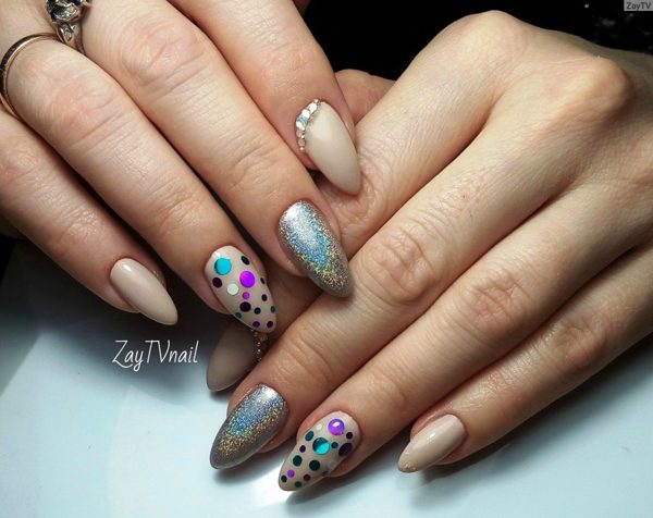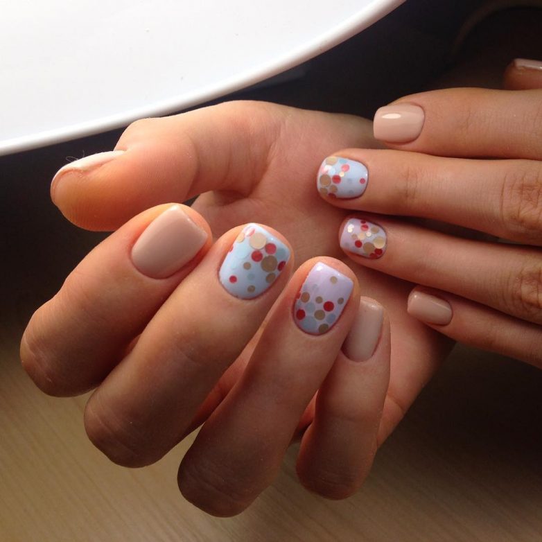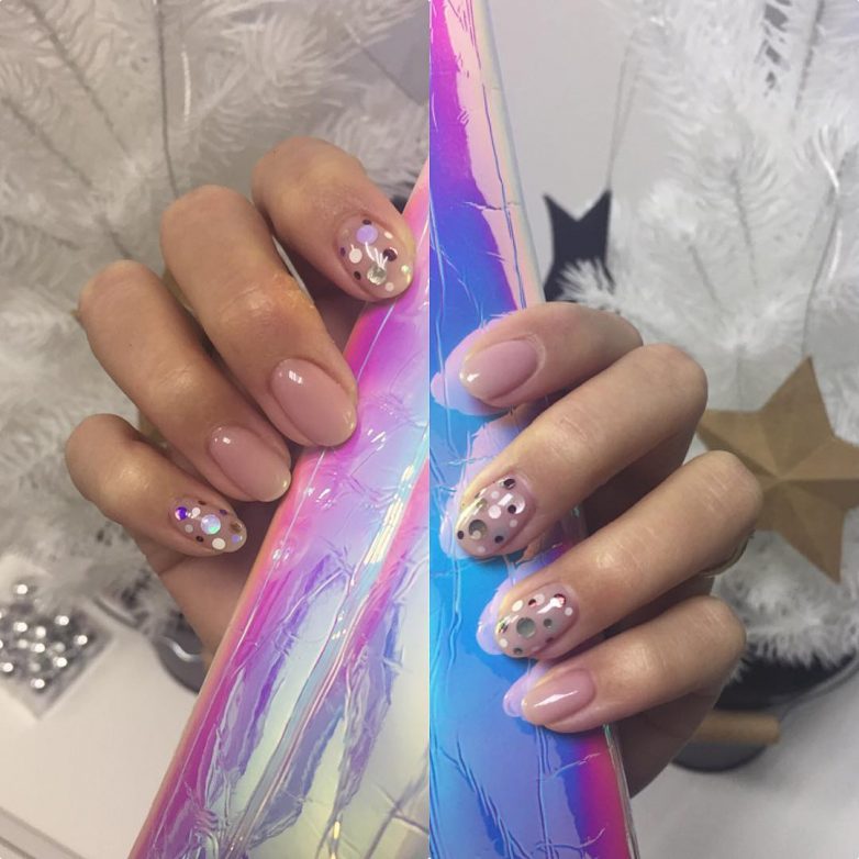 Для создания такого минималистичного маникюра, но в то же время насыщенного и яркого, не нужно много усилий. Для этого нужно только выбрать основной материал конфетти круглой, квадратной, и иной формы. И, да, такой маникюр выполняется с помощью гель-лака. В этом случае блестящий декор оказывается под его надежным слоем. База должна быть нейтрального оттенка. Располагать камифубки по ноготку можно в любом хаотическом расположении.