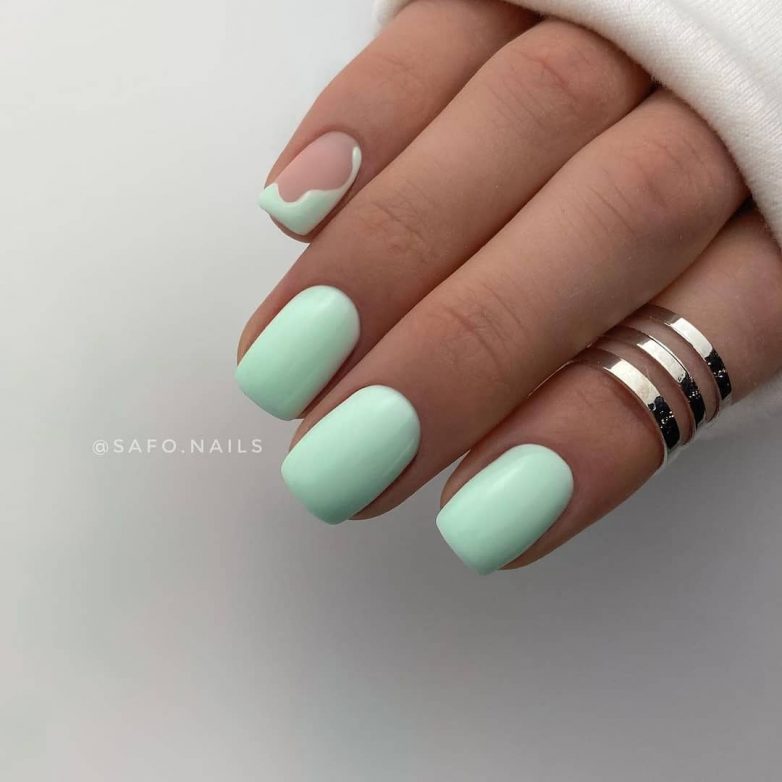 Френч в своем привычном виде с белой улыбкой уже не настолько актуален, как раньше. Сегодня модницы желают выбирать более креативные идеи для оформления французского маникюра. В мае можно выполнить стильный дизайн, в котором улыбка будет по-прежнему белой, а общий фон зеленым. Такой контраст смотрится достаточно ярко, но при этом полностью соответствует модным трендам.