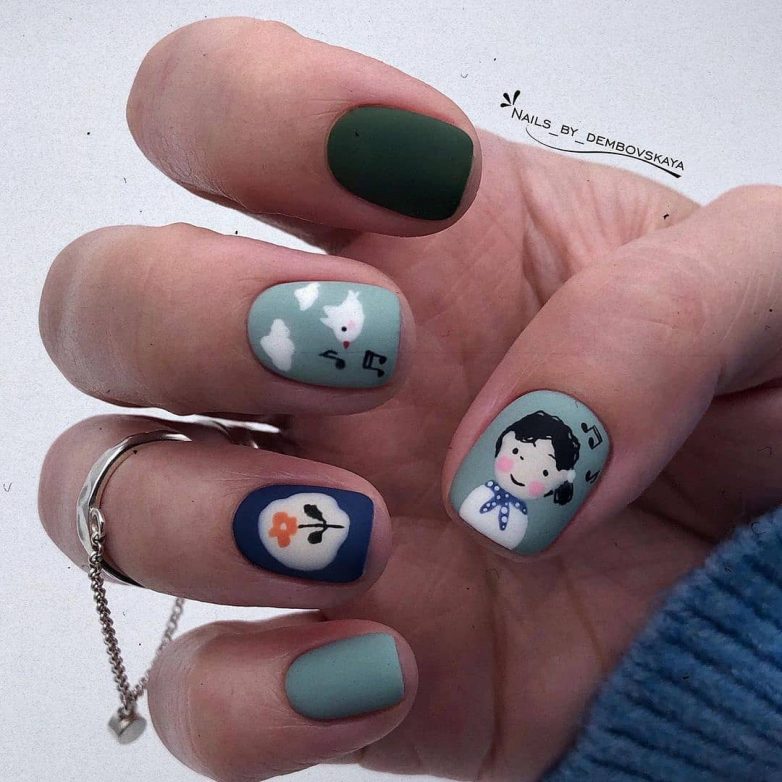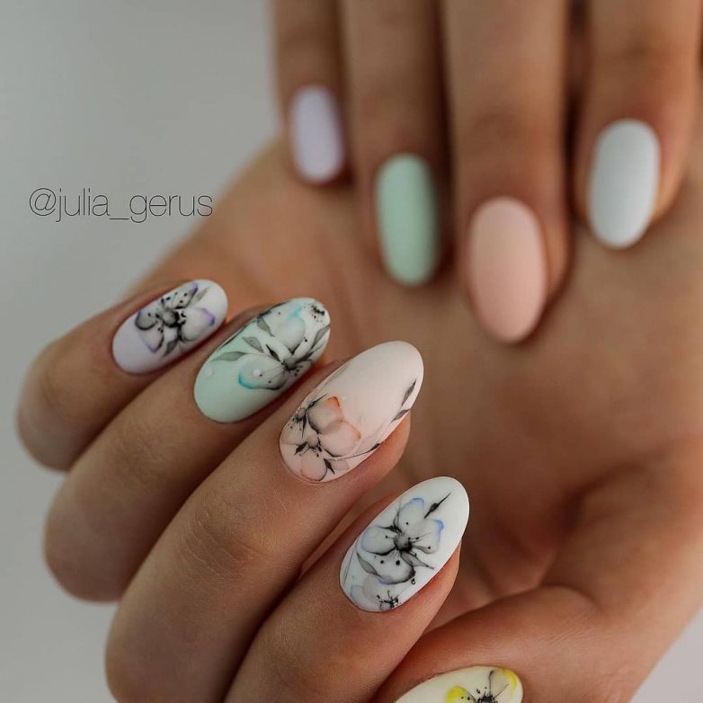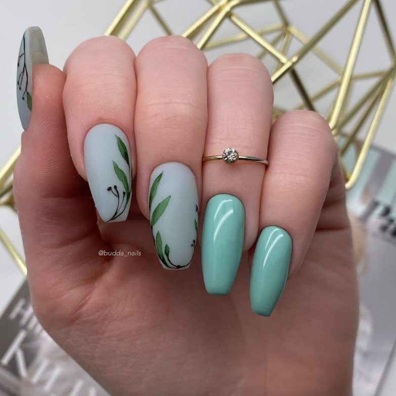 Весной многие дамы отдают прочтение самой женственной тематике – флористике и цветочным мотивам. Для маникюра на май можно выбрать общий зеленый тон и небольшие веточки в черном контуре. Также подойдут рисунки бабочек, птичек или разнообразных букетов красивых цветов.