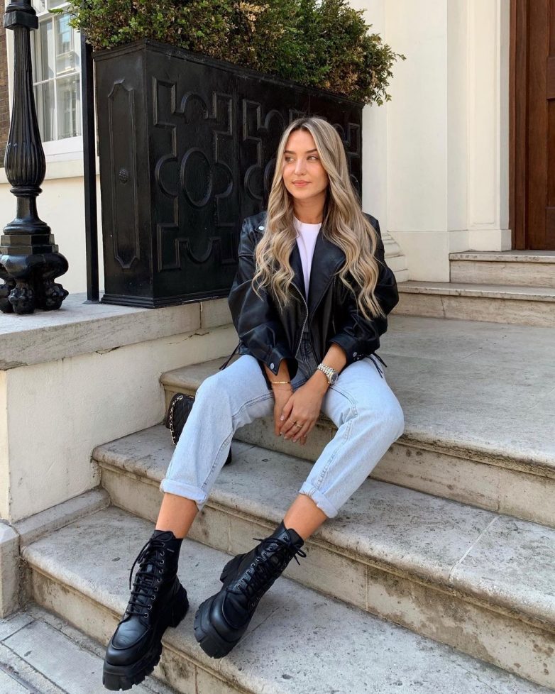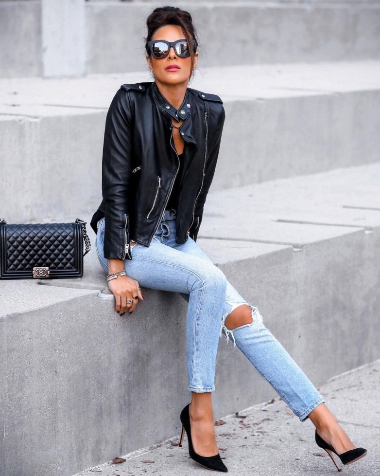 Лучшая пара – это кожаная куртка и джинсы. Вы можете выбрать совершенно любой фасон любимых джинс: мом, обтягивающие, бананы, рваные и другие. Косуха тоже может быть как в классическом фасоне, так и в оригинальном стиле оверсайз. Что касается обуви, то женщины вольны выбирать любую модель на каблуке, танкетке, платформе или на низком ходу.