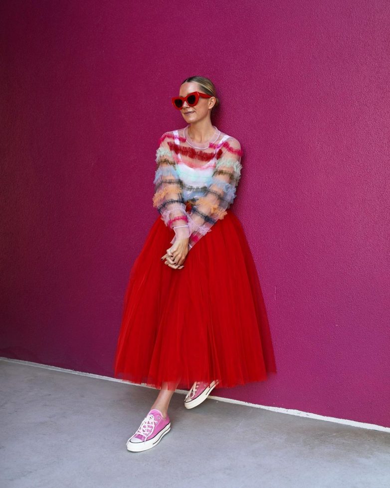 Впрочем, юбка из фатина довольно оригинальная деталь, поэтому ее смело можно носить с любимыми кедами.